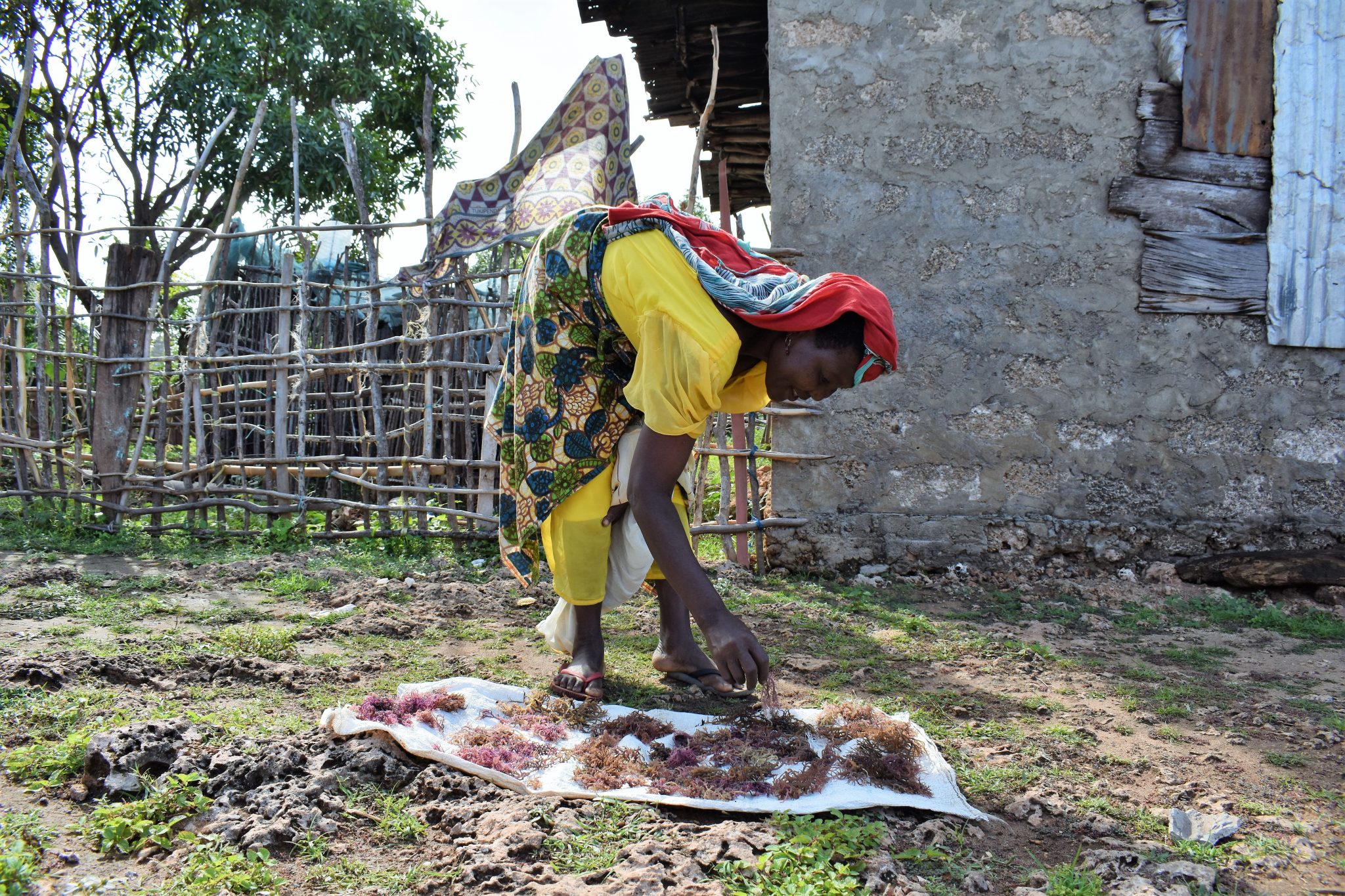 Una donna del villaggio prepara le alghe per l'essiccazione nel giardino della propria abitazione - Foto: Martina Bolognesi