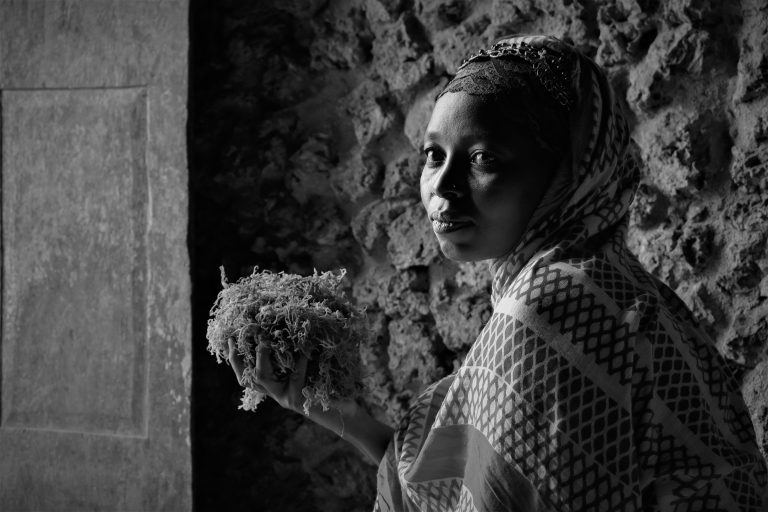 Mzungu, la donna che ci ha accompagnato nella missione, a Mwkiro ci è nata e ci ha sempre vissuto. Sposata all’età di 16 anni, è la seconda moglie di un uomo con cui ha avuto sei figli. Ci dice con orgoglio che è la vice coordinatrice del gruppo di donne impegnate nella coltivazione delle alghe, un’attività iniziata nel 2009 su impulso del Governo. Da allora, Mzungu e le altre lavorano cinque giorni a settimana, con orari variabili che dipendono dalle maree capricciose dell’Oceano Indiano. La giornata lavorativa le impegna fino a sei ore, durante le quali le alghe “pronte” vengono raccolte o piantate lungo i filari subacquei. Le alghe raccolte vengono stipate in sacchi di plastica che le donne si caricano in testa e trasportano sino al villaggio, camminando quasi un’ora. Ogni sacco di alghe, intrise e gocciolanti di acqua marina, può arrivare a pesare fino a 50 kg, e il tragitto da percorrere con il sacco in equilibrio sulla testa è faticoso: oltre al peso da sopportare, le donne spesso camminano nell’acqua sotto il sole feroce dell’equatore, e devono prestare attenzione a dove mettono i piedi per non inciampare nei coralli aguzzi del fondale. Una volta raggiunto il villaggio, i sacchi vengono svuotati e le alghe adagiate su panni variopinti esposti alla luce del sole nei cortili delle abitazioni o per strada, per essere essiccate.