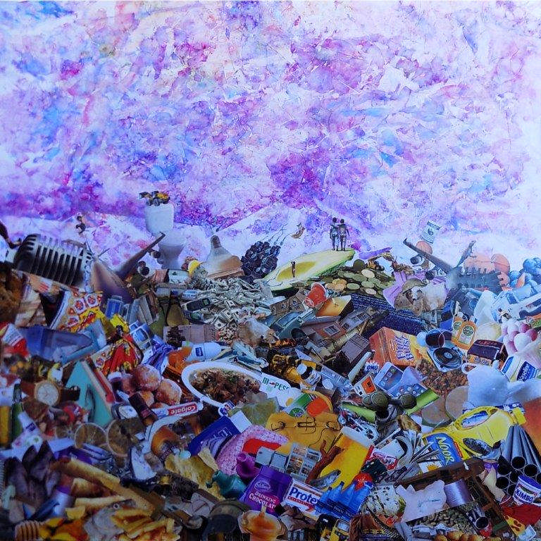 Juma Wallace, 30 anni, è cresciuto a Dandora, uno degli slum più estesi di Nairobi e sede della più grande discarica dell’Africa orientale. Nella sua mostra ha voluto riflettere il paesaggio intorno alla discarica che rappresenta un grave pericolo per la salute e per l’ambiente, ma allo stesso tempo per molte persone unica fonte di reddito e dunque di vita. Nei suoi collage, creati con immagini ritagliate da vecchi giornali e disposte su sfondi colorati, ci si perde nell’osservare il gran numero d’oggetti che la nostra società produce e getta.